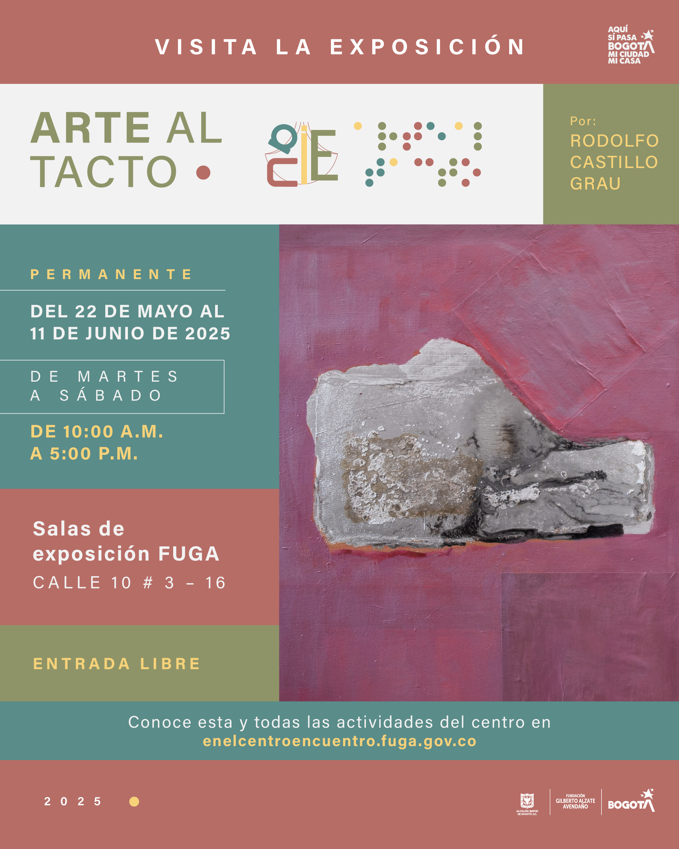 Visita la exposición Arte al Tacto del artista Rodolfo Castillo Grau. De martes a sábado de 10:00 a.m. a 5:00 p.m. en las salas de exposición de la FUGA. Calle 10 N° 3-16