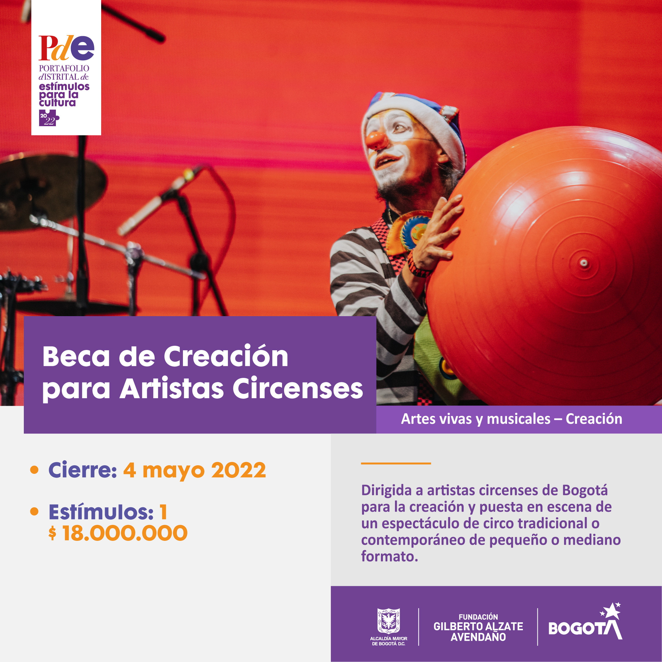Esta convocatoria busca promover y apoyar tanto la creación como la puesta en escena de un espectáculo de circo tradicional o contemporáneo de pequeño o mediano formato, realizada por artistas circenses de Bogotá.